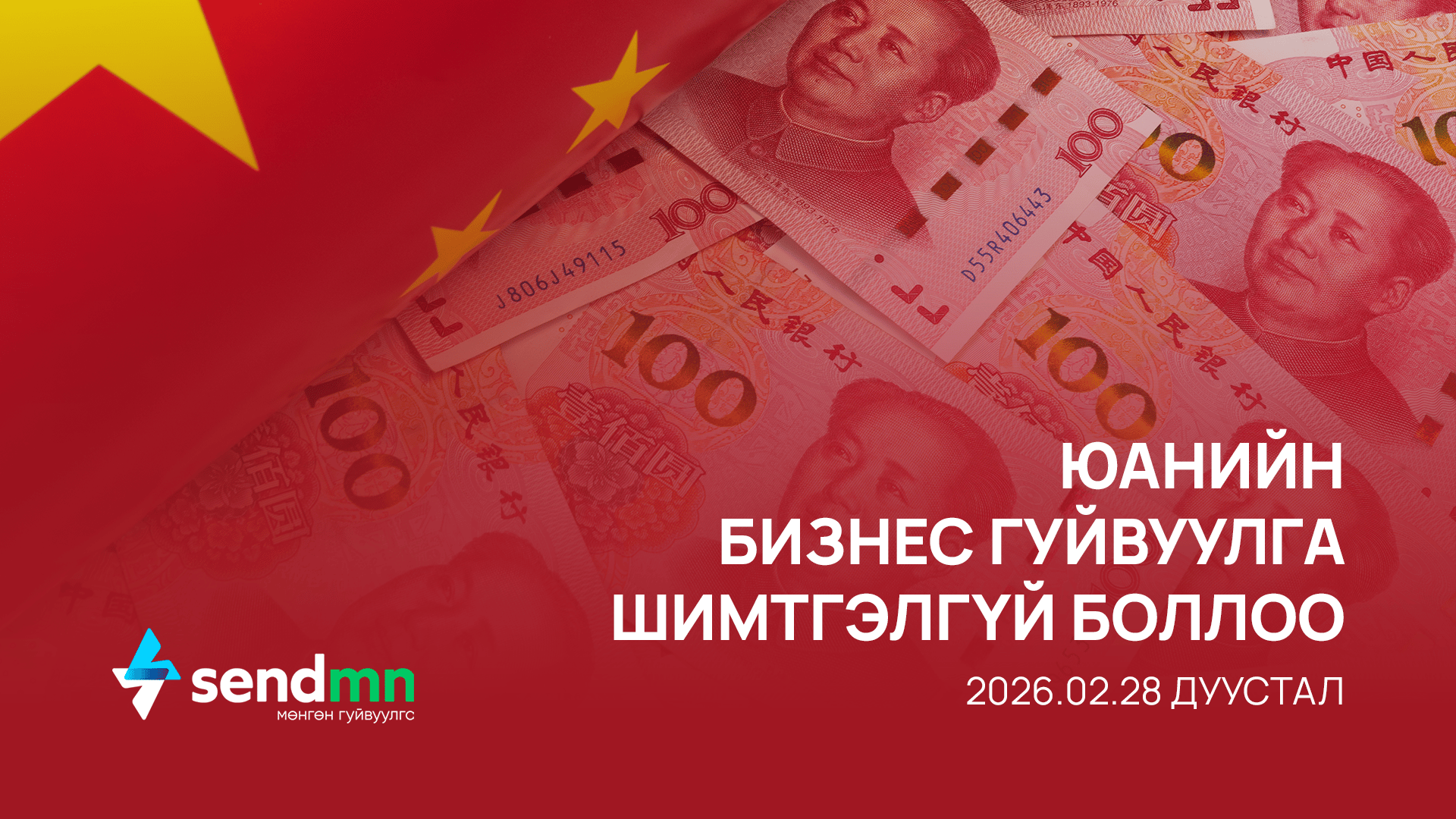 Хятад улстай худалдаа, бизнесийн харилцаатай байгууллага, аж ахуйн нэгжүүдэд зориулан SendMN компаниас БНХАУ руу юань (CNY) илгээх албан ёсны гуйвуулгын үйлчилгээний шимтгэлийг 2026 оны 2 сарын 28-ныг дуустал 0₮ болгож байна.